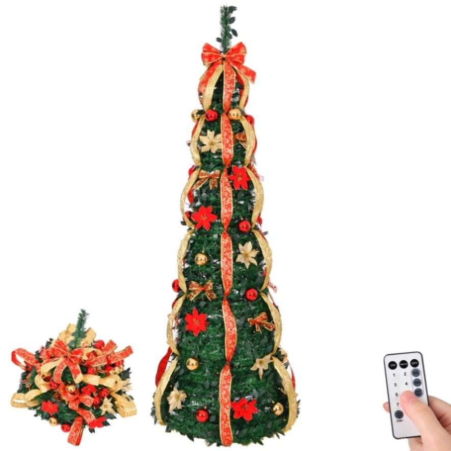 1. Fully Decorated: This fully decorated pop-up Christmas tree takes the stress out of holiday decorating. With its lifelike branches adorned with holly leaf accents, twinkling fairy lights, bows and ribbons, shimmering balls, poinsettias, and a striking bow topper, it brings festive magic to your space in seconds—no additional decor needed.