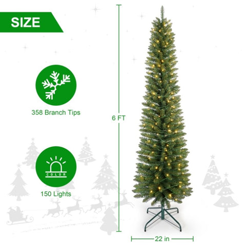 Artificial 6ft Green pencil Christmas Tree with 358 PVC Branch Tips, 150L Warm white led, Foldable 43674969
