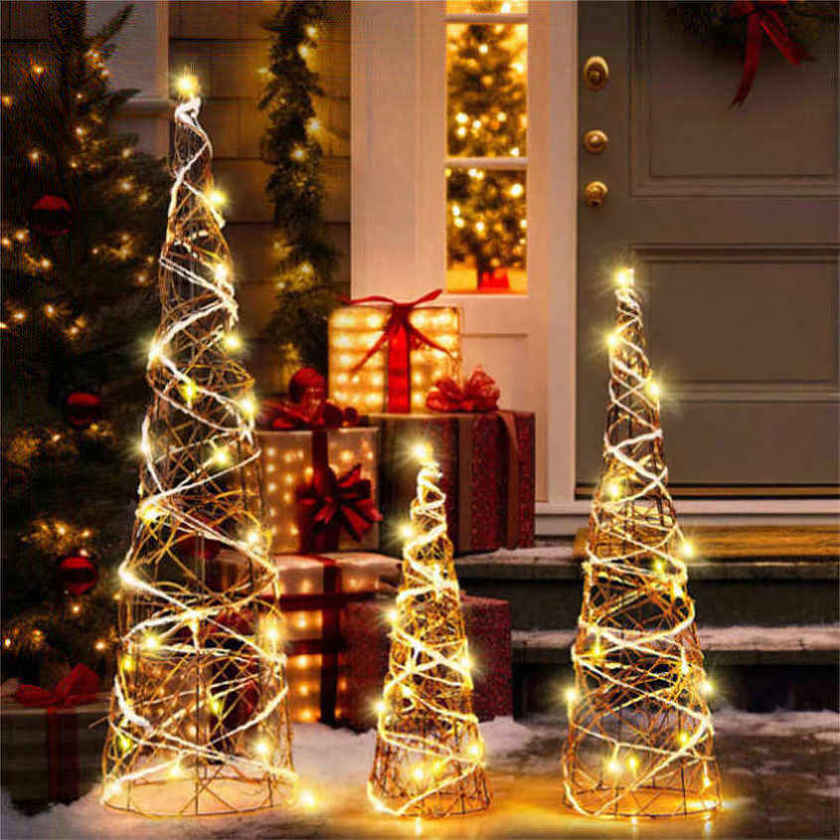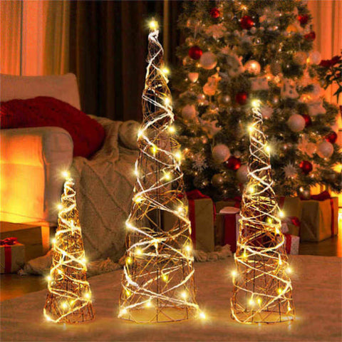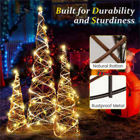 Set of 3 Pre-Lit Christmas Cone Trees - 60 Warm White LEDs, 32"/24"/16" Sizes, Brown Rattan 68689856