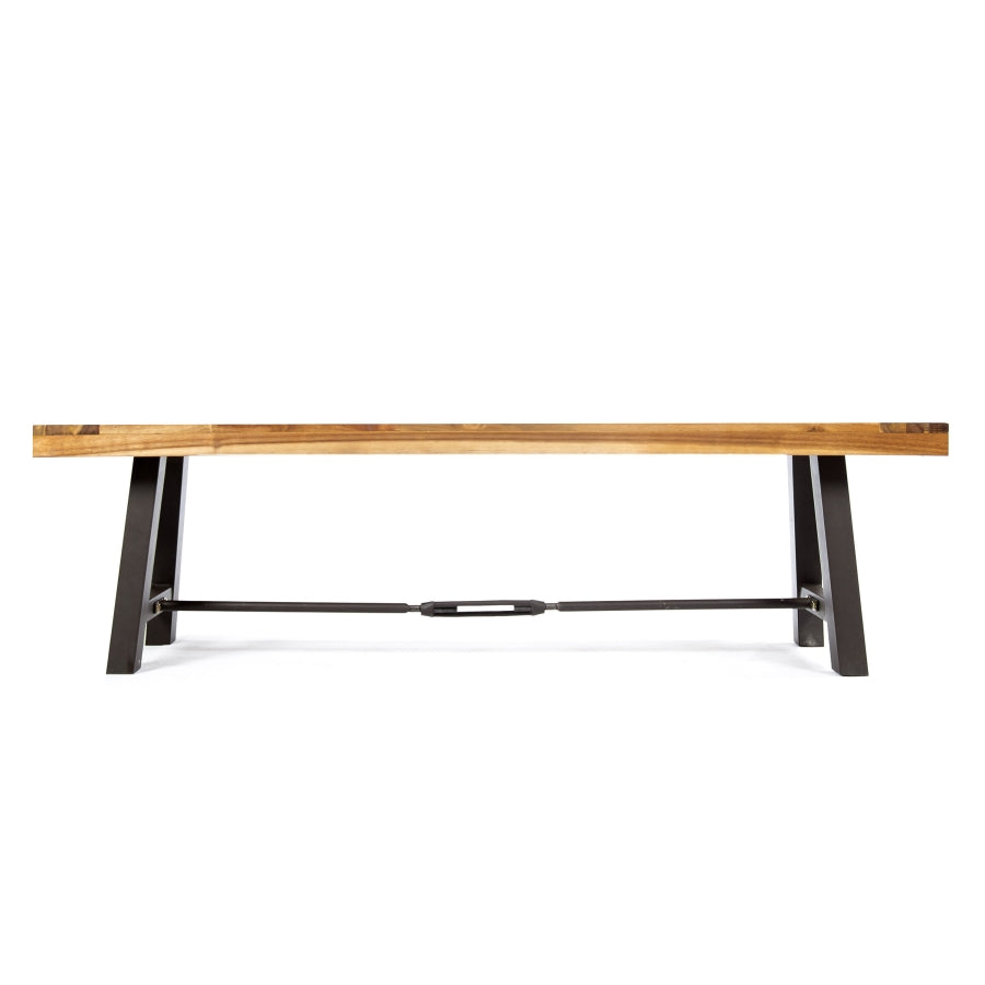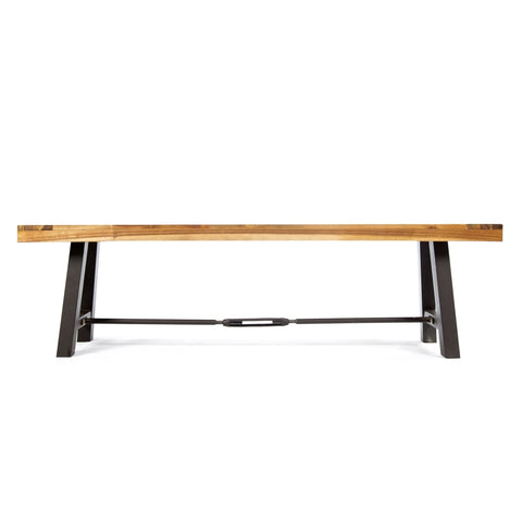 Offer your outdoor seating ensemble an addition that you will not regret. Our sophisticated slat-panel bench brings a perfect amount of stylish comfort and modern industrial aesthetics to your backyard or patio. Featuring a durable powder-coated metal frame and a finished rich acacia wood top, our bench is an excellent addition to your outdoor decor.