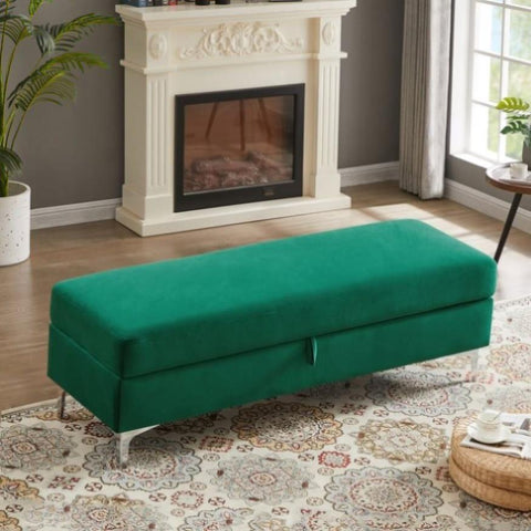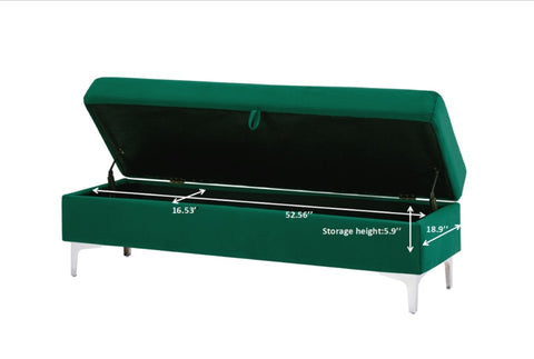 It can be used as an extension of the sofa or as a storage space in the living room and bedroom. In addition, it can also be used as a storage box and a small stool in a children's room to organize clothes, toys, books, CDs, etc. It can also be used as a footstool, bedside stool, stylish chair, shoe stool or free. Put it in front of the sofa and let your feet and feet rest. Additional storage space: The spacious storage footstool can easily meet your various needs. You can put this storage footstool at the end of the bed to store extra blankets and pillows, or as a storage box for toy boxes. The perfect space-saving storage space makes your room more tidy. The comfortable velvet and sofa are supported by metal three-pronged legs, which can withstand 500 pounds. It can be assembled with your friends and it takes about 20 minutes. Material: Fabric: Velvet Wooden frame: Eucalyptus Feet: metal hardware feet color: silver Product size: 55.9''*18.9''*17.52'' Net weight: 35.3 pounds Packing size: 56.11''*19.3''*12.6'' Gross weight: 44.1 pounds Weight bearing: 500 pounds A bag