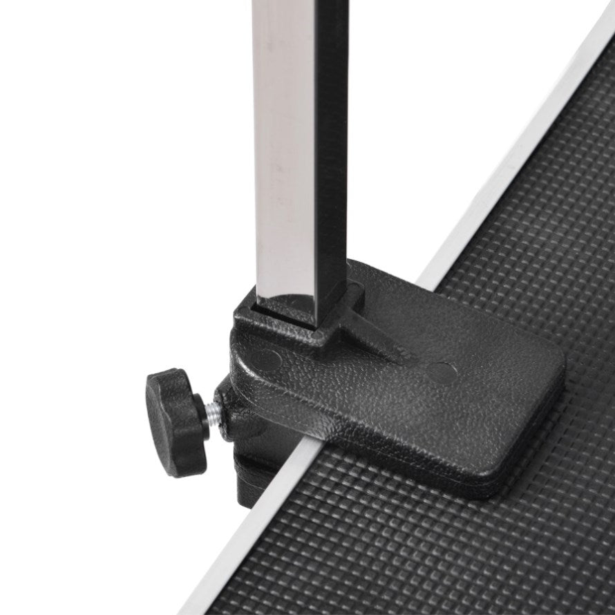 Comes with a clamp-on Adjustable Grooming Arm and security nylon Loop to Fix the dog for grooming. Adjustable Arm: the height of the arm adjustable to fit different dogs' needs.