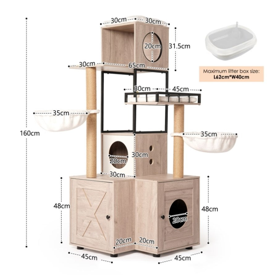Innovative Multi-Functional DesignThis 63" tower ingeniously combines a litter box (24.4"L×15.8"W) with activity zones. Features dual scoop condos and scratching posts, utilizing 60% more vertical space for complete feline needs.