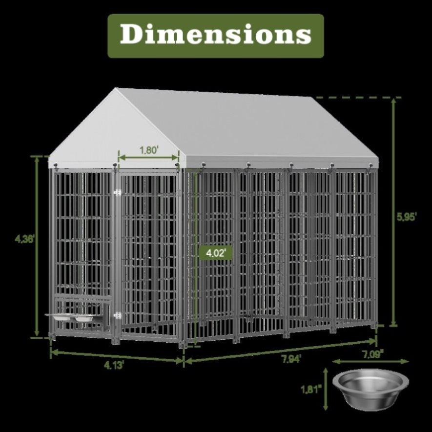 Spacious living space: Measuring 7.94’L x 4.13’W x 5.95’H, this oversized outdoor dog house provides a spacious living area for your furry friends. Ensure ventilation and visibility to create a comfortable and safe home for your furry friends.