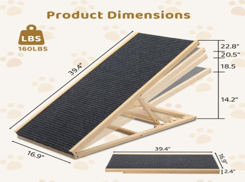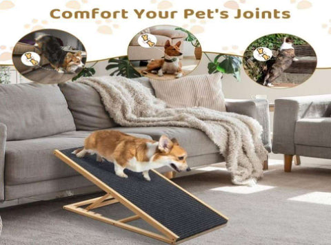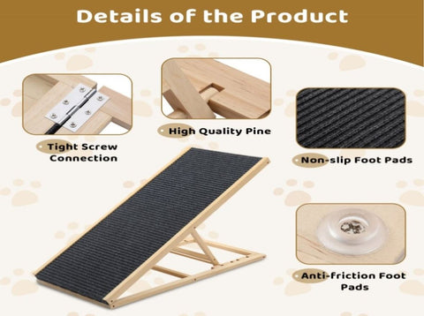 Give your furry friend the comfort and independence they deserve with this sturdy and adjustable pet ramp. Designed for both small and large dogs, this ramp helps pets safely reach high beds, couches, and vehicles without straining their joints. The adjustable height offers four levels to accommodate different surfaces, while the soft fabric-covered surface ensures a secure grip. Built with durable pine wood and non-slip foot pads, this foldable ramp is easy to store and transport, making it a must-have for pet owners looking for convenience and safety.