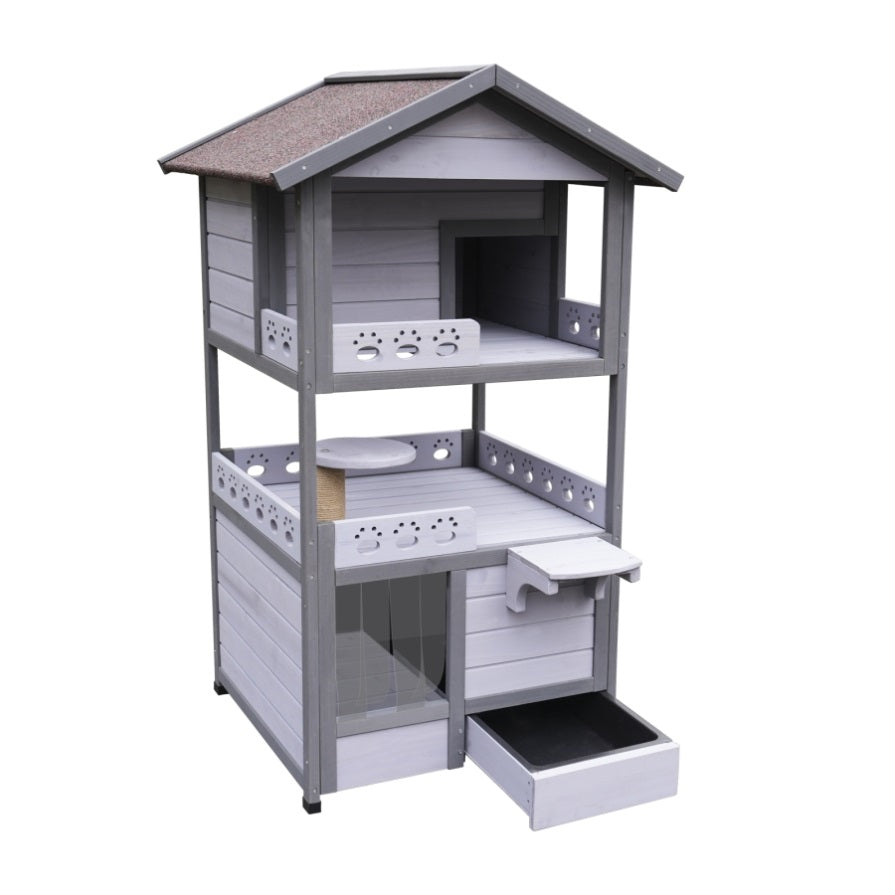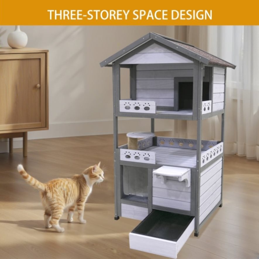The first floor is equipped with a litter box to solve your cat litter problems,outdoor three cat house is perfectly separated from the rest, play, and cleaning areas