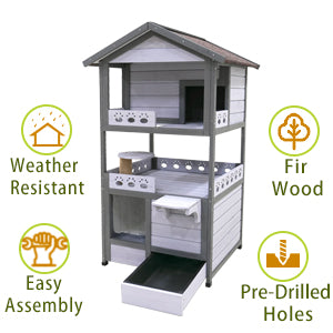 Three Story Outdoor Cat House with Balcony offers a large feral villa cat shelter, perfect for multiple cats. With cage dimensions of 28.5"L x 28.3"W x 48.8"H, this cat house provides ample space for your feline friends to roam and relax.