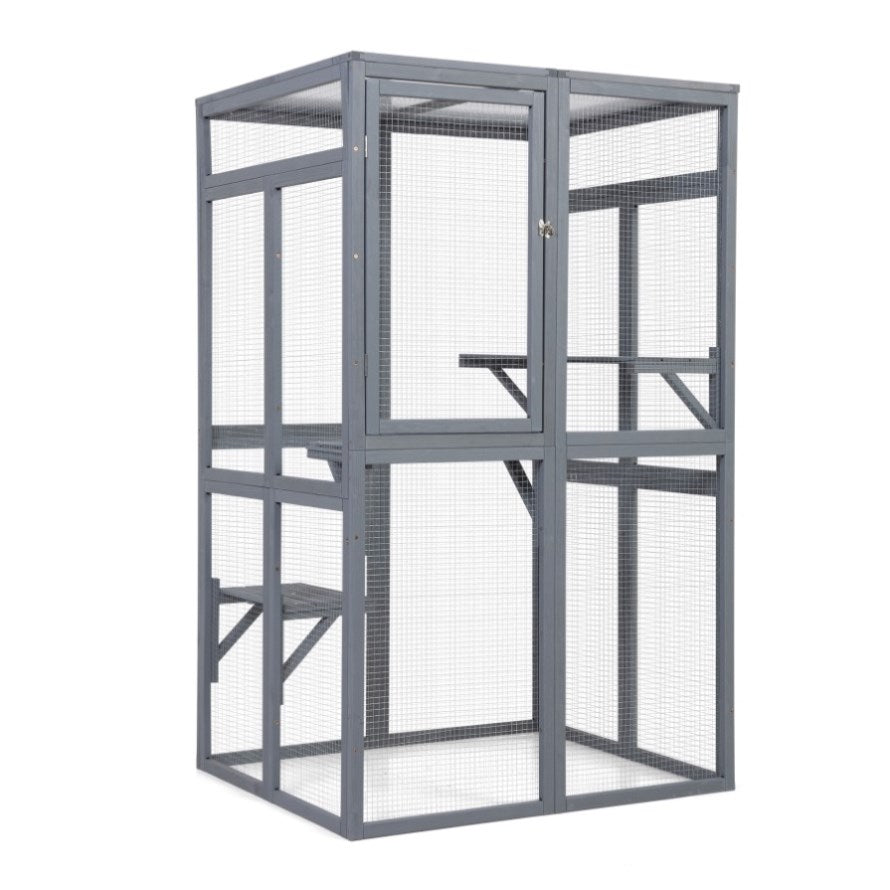 Safe and Comfortable Living Place: Crafted of premium pine wood, this outdoor cat enclosure boasts a robust frame. The cat house has an ample living area with heavy-duty galvanized wire mesh to help air circulation.