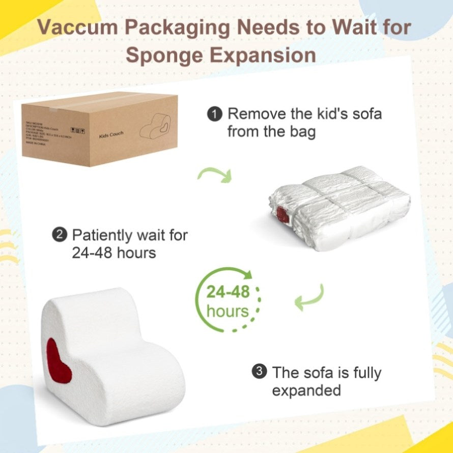 Vacuum Packaging: The toddler chair is vacuum-packed and arrives pre-assembled. It will expand to its full size within 48 hours of being unpacked. While some minor wrinkles may occur due to prolonged pressure, these will naturally smooth out within a couple of days