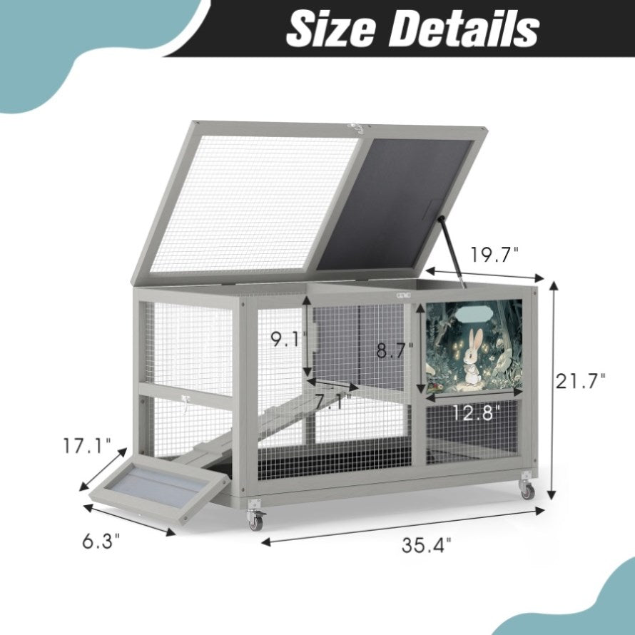 2-Tier Bunny Hutch, Wood Rabbit Cage on Wheels with Openable Roof, Ramp, Easy-to-Clean Tray, Guinea W2181P356045