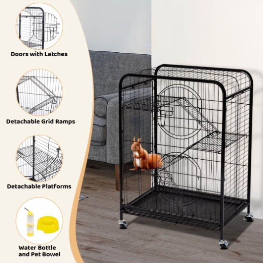 1. Spacious Multi-Level Play Area: This cage features 4 levels connected by sturdy ramps, providing ample space for your small animals to climb, explore, and play. Whether for ferrets, guinea pigs, rabbits, squirrels, or kitten, the multi-level design encourages physical activity and mental stimulation, creating an engaging and fun environment for your pets.