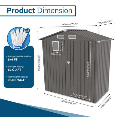 : 6X4FT (approximately 73.23×43.7×72.83 inch), suitable for balcony and courtyard corners. It can easily accommodate garden tools, sports equipment and daily miscellaneous items. The internal space can be equipped with shelves and hooks to achieve orderly and categorized storage.