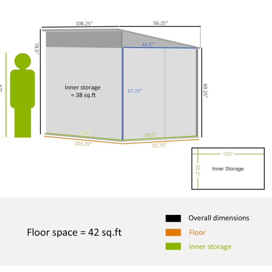 - - Floor Area: 52.75" W x 103.25" D, 38ft²