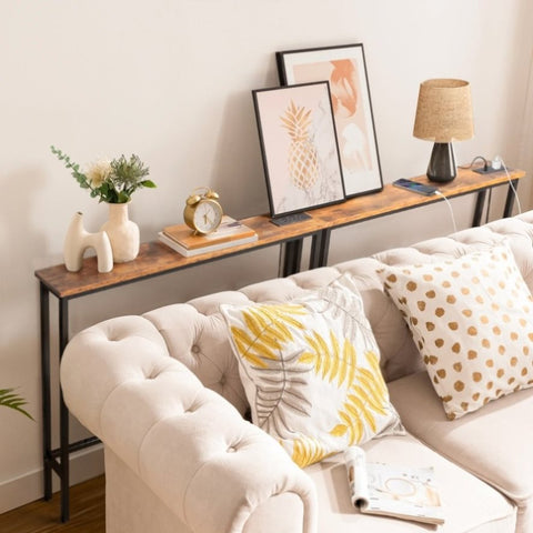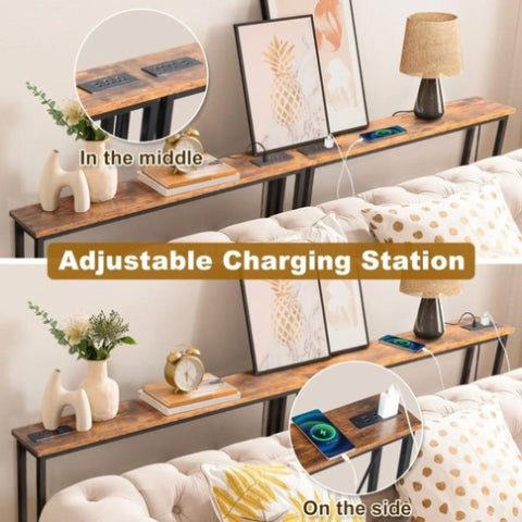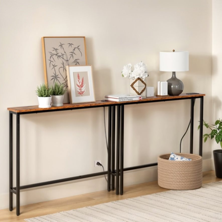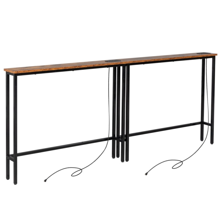 Maximize your space and functionality with this 2-pack of 39.4" Narrow Console Sofa Tables. Designed with a sleek modern design and durable metal frame, each table fits perfectly in tight spaces behind sofas or along walls, especially where wall vents are present. These tables feature built-in power outlets and USB ports, allowing you to easily charge laptops, phones, and more. With their minimalist design and practical features, they are a stylish solution for apartments, dorms, or living rooms.