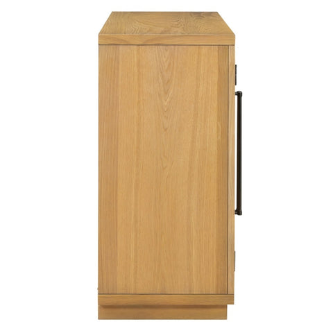 High-Quality Materials: The storage cabinet, made of high-quality MDF with oak veneer and rubber wood frame, ensures sturdiness and stability. Metal handles resist deformation. Its spray-painted wooden surface with wire drawing and glazing gives an exquisite appearance, using eco-friendly, odorless materials. Tabletop capacity: 275 LBS, shelf capacity: 150 LBS, bottom shelf capacity: 275 LBS.