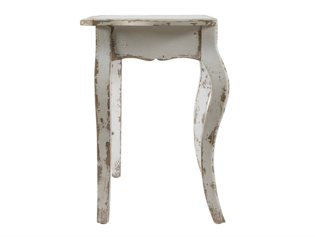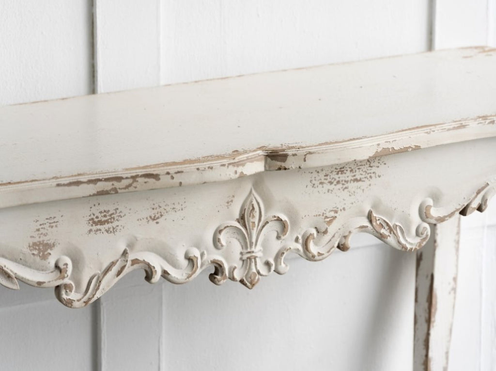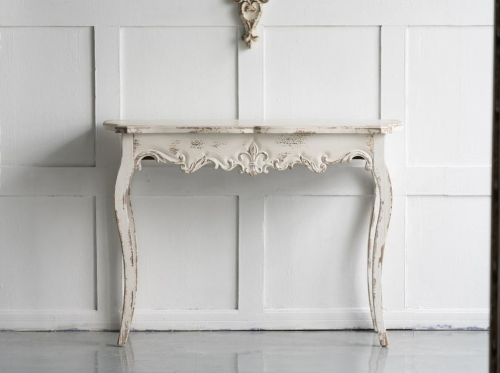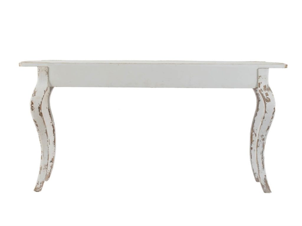 A weathered off-white finish highlights the lived-in, vintage look of a console table that's decorated with a scallop edge at the tabletop.