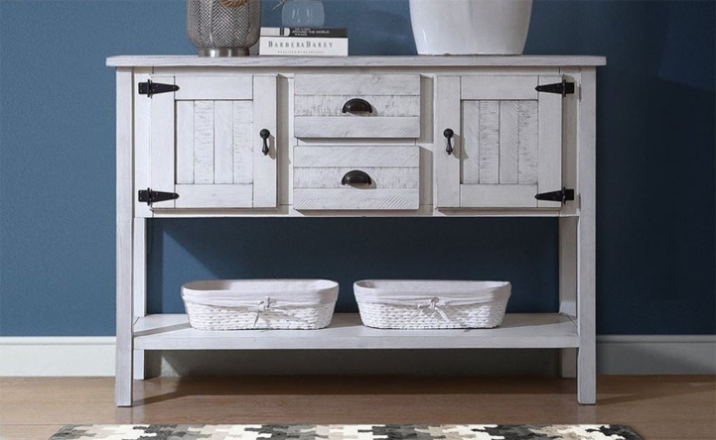 『Sturdy & Stable Construction』: This buffet table is mainly made of SOLID PINE WOOD with environment-friendly painting, which is wear-resistant and durable for long-term use. The top shelf and cabinets frame, and four legs are all made of solid pine wood,which are extremely sturdy and stable to support up to 220 lbs without wobbling(weight capacity: tabletop 220LB; bottom shelf 44LB, cabinet and drawer: 26LB)