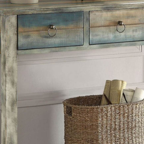Console tables featuring a vintage-inspired antique grey and teal finish, adding timeless charm to your home decor