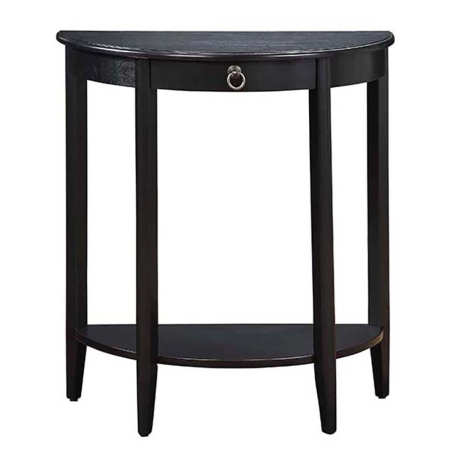 Featuring a unique half-moon shape, this console table adds elegance and style to your space while maximizing functionality with its lower shelf for additional storage or display. Crafted with a wooden frame and supported by square wooden legs, it showcases a timeless design that blends seamlessly with various decor styles and adds a touch of classic charm.