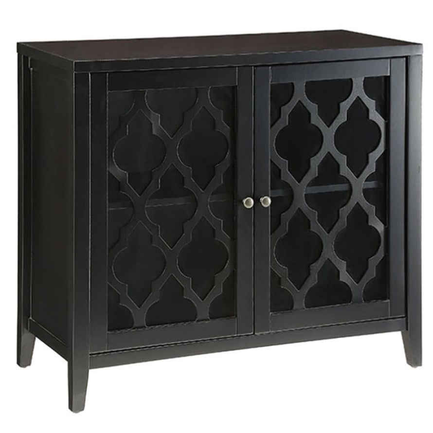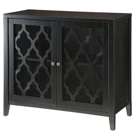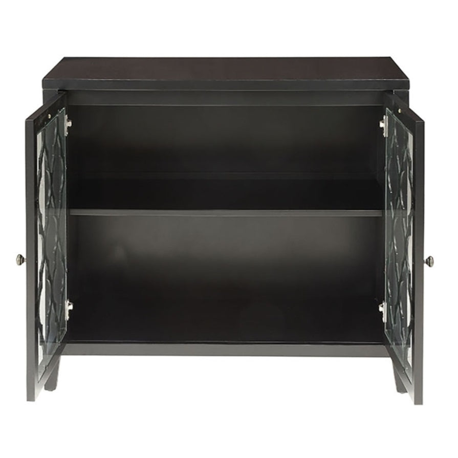 The console table features glass doors that open to reveal a shelf inside, providing both storage and a stylish display area for your items