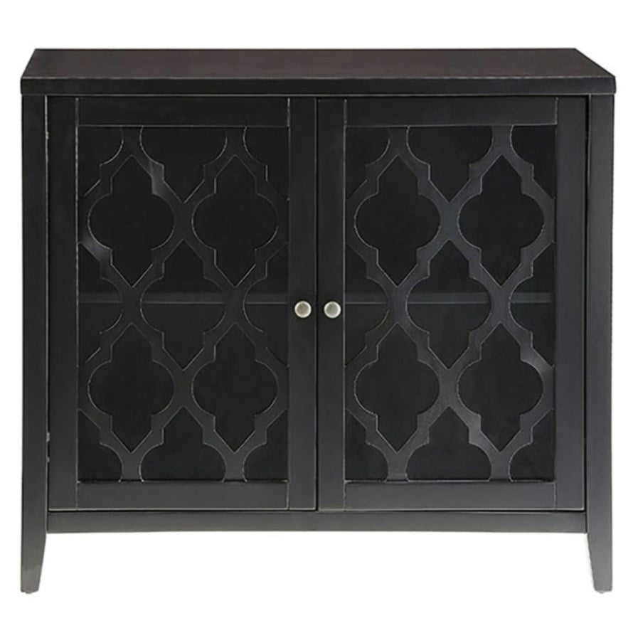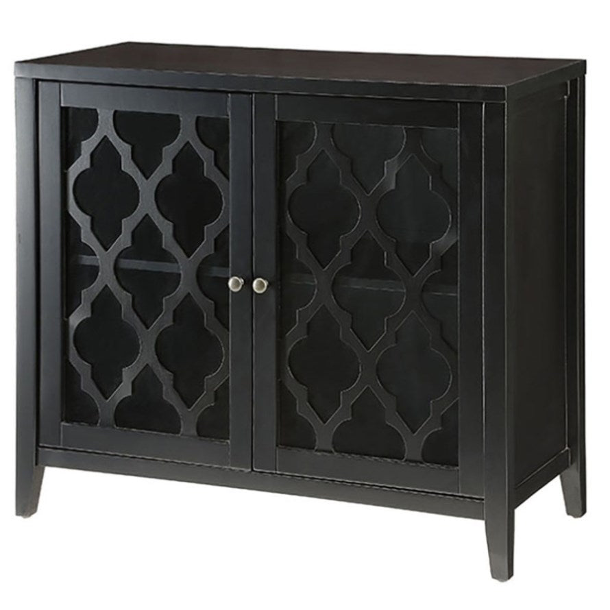 The glass doors are equipped with knobs as door handles, making it easy to access the interior while contributing to the table's overall design aesthetics.