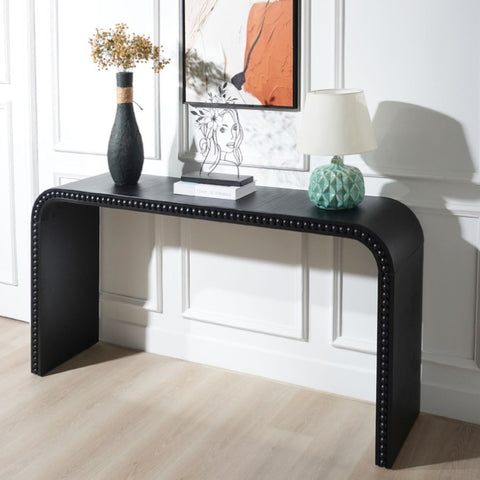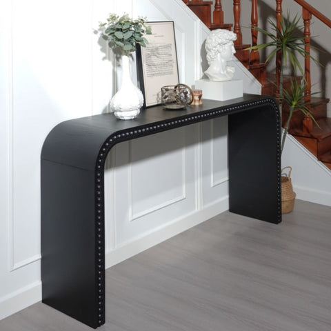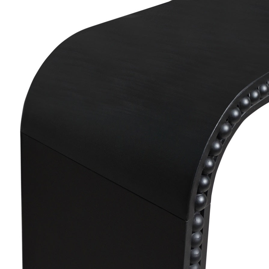 Enhance your home with this sleek black wood console table, blending modern sophistication with timeless craftsmanship. Its curved waterfall silhouette and handcrafted wooden bead detailing make it a standout piece for any space.