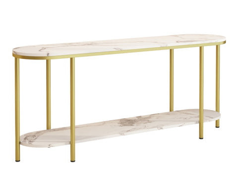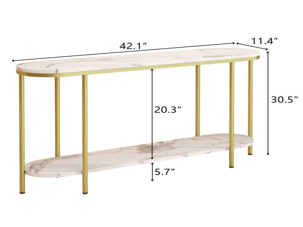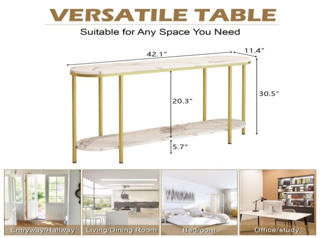 【Elegant Minimalist Style】: The popular but exquisite combination of gold metal tones and faux marble finish makes this narrow sofa table an instant hit in any space, especially ones based on modern design styles.