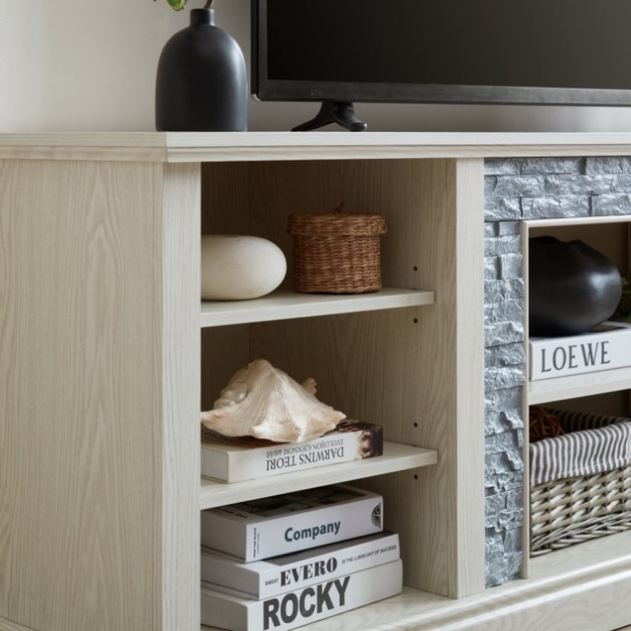 [Faux stacked stone surround] It gives this TV stand entertainment center a traditional style and with plenty of shelving, you can keep your space neat and tidy.