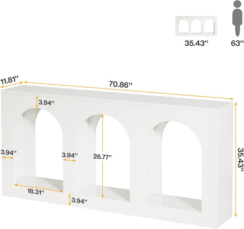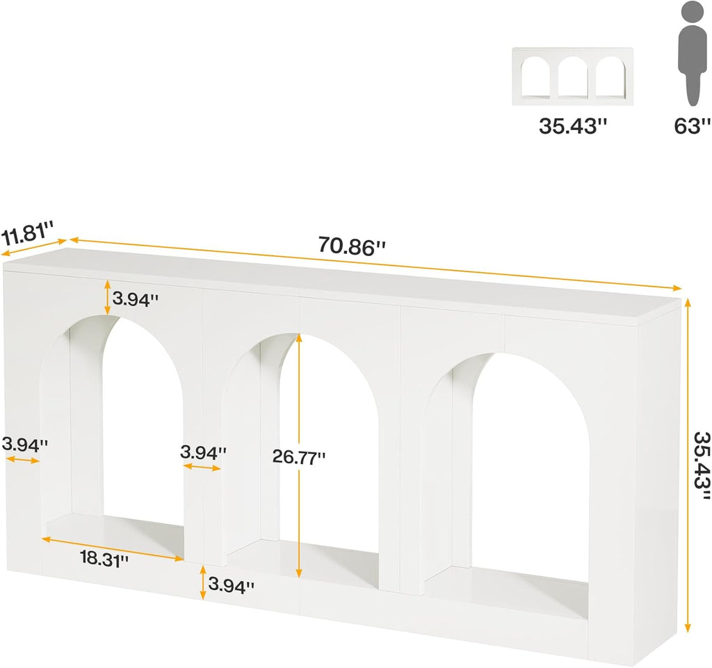 - Spacious Storage Options: Measuring 70.9" W x 11.8" D x 35.4" H, with its three large arched shelves, this entryway table offers ample space to store and display. The open design allows for easy access and visibility, helping you keep your space organized