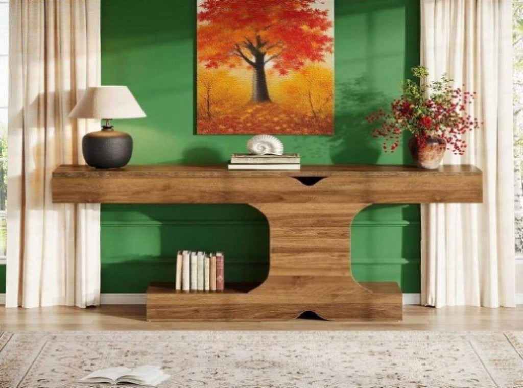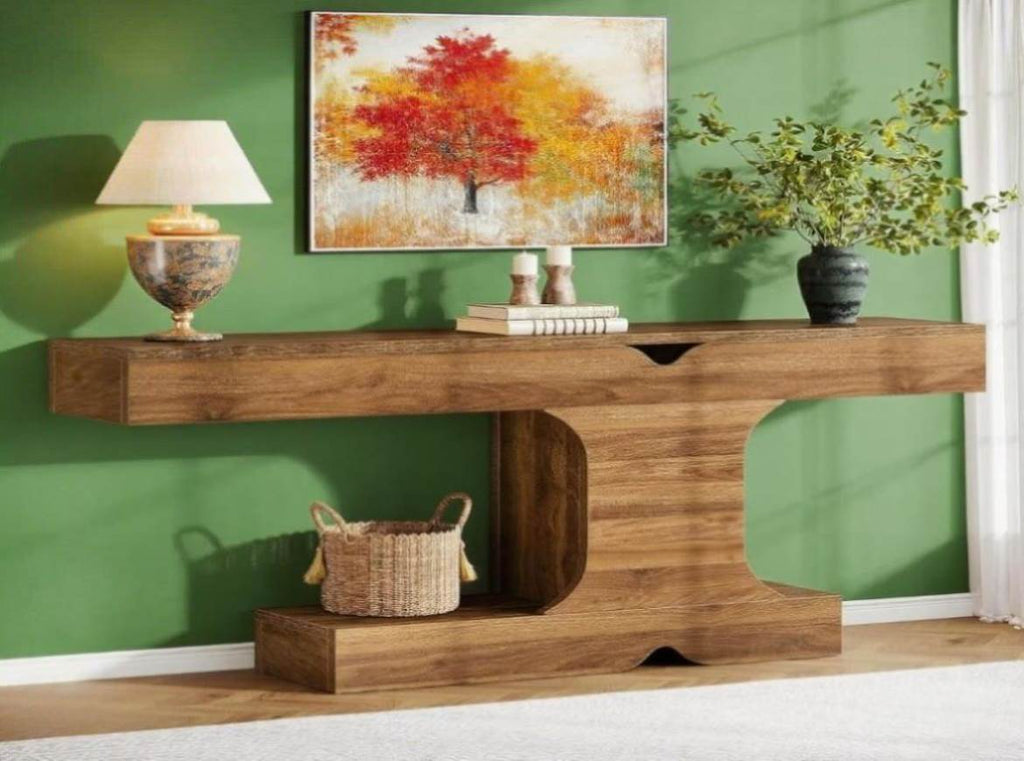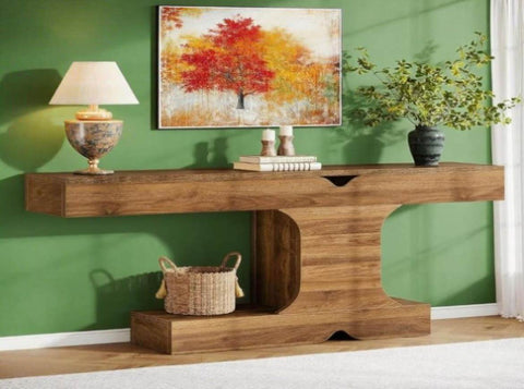 - A Striking Console Table: This Tribesigns console table radiates a rustic appeal with its farmhouse design. Its extended length coupled with its unique I-shape makes the table a sophisticated focal point of your space