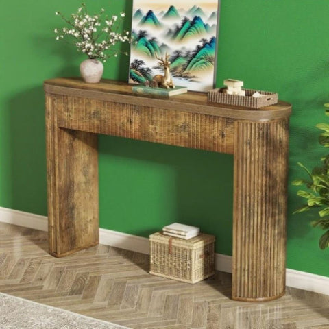 - Warm Curves Ahead: This fluted console wraps your entry in elegance. Designed with soothing curves to cradle your space in comfort, it features fluted detailing along semi-circular table legs and edges, infusing any room with a warm, inviting vibe