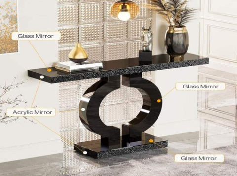 - 【Contemporary Mirror Design】: Our console table shines with a pristine mirrored finish and a unique O-shaped base, infusing an immediate dash of modern elegance into any space. Its design not only augments brightness and feeling of expansiveness, but also complements various décor styles, right from minimalist to lavish. The gleaming acrylic diamond veneer on its surfaces further raises its alluring appeal. (The console table mirrors include surfaces made of glass and surfaces made of acrylic material.)
