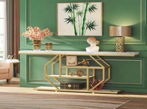 【Time for a New Console】Looking for a wonderful sofa table? Offer gorgeous style and storage all wrapped up in one with our gold console table. Defined by a faux marble veneer top with realistic-textured while sitting on an openwork frame base, this modern entryway table will set the tone in your home. Welcome the console into your home today!
