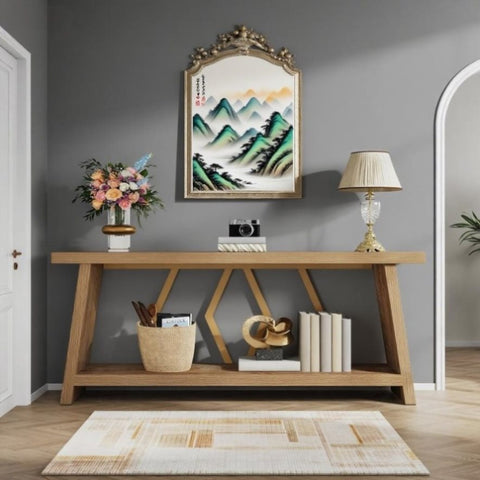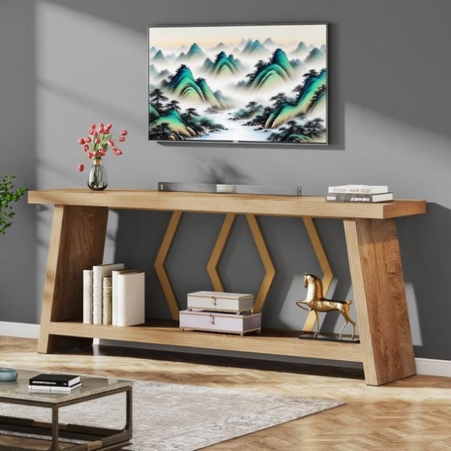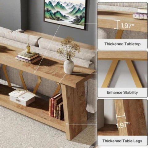• Double-Decker Display: The 70.86-inch extra long sofa table comes with a two-tier design. This means double the display space for your cherished artifacts, books, or décor items, neatly arranged, always at arm’s length.