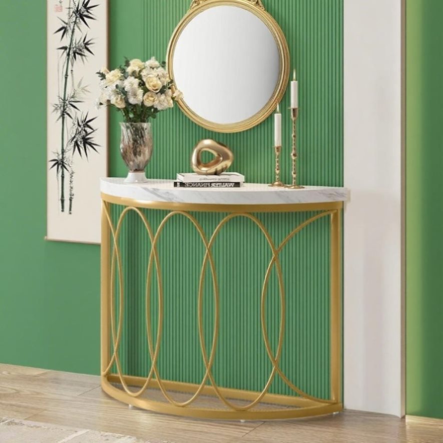• UNIQUE HALF MOON DESIGN: Minimalist and elegant curved half moon design matches well with your modern home. Besides, three stylish oval base design adds a glamorous look for the gold console table. A semi-circle table will creates a fashionable family atmosphere and visual appeal for your families and guests.
