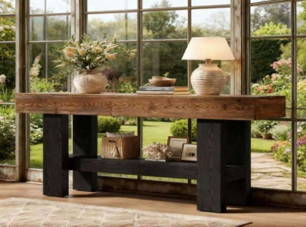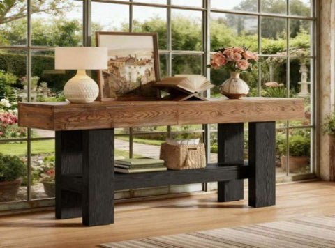 Rustic & Natural Charm: This long console table, crafted from 100% solid wood, highlights the raw beauty of natural timber. Its distinctive knots and textures lend rustic character and are elevated by a striking two-tone finish of black and brown