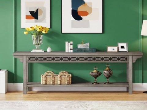 - Farmhouse Console Table: Infused with a farmhouse style, this long sofa table boasts a sleek, timeless design with gray finish and clean lines on its tabletop, making cleaning a breeze and ensuring seamless coordination with other industrial pieces in your home.