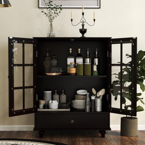 Multifunctional:This cabinet can be used as a sideboard in living room to fill in your favourite collections, or a buffet server cabinet in kitchen to put the tableware, bowls and dishes.With the glass doors you can show off as well as protect they from dust.