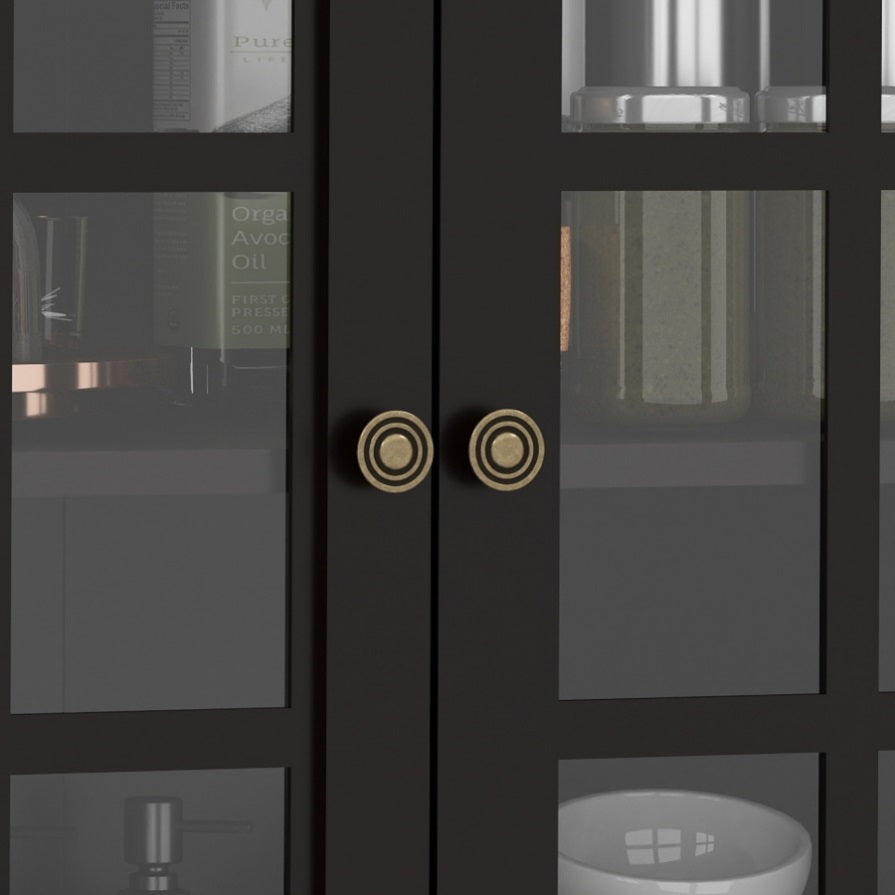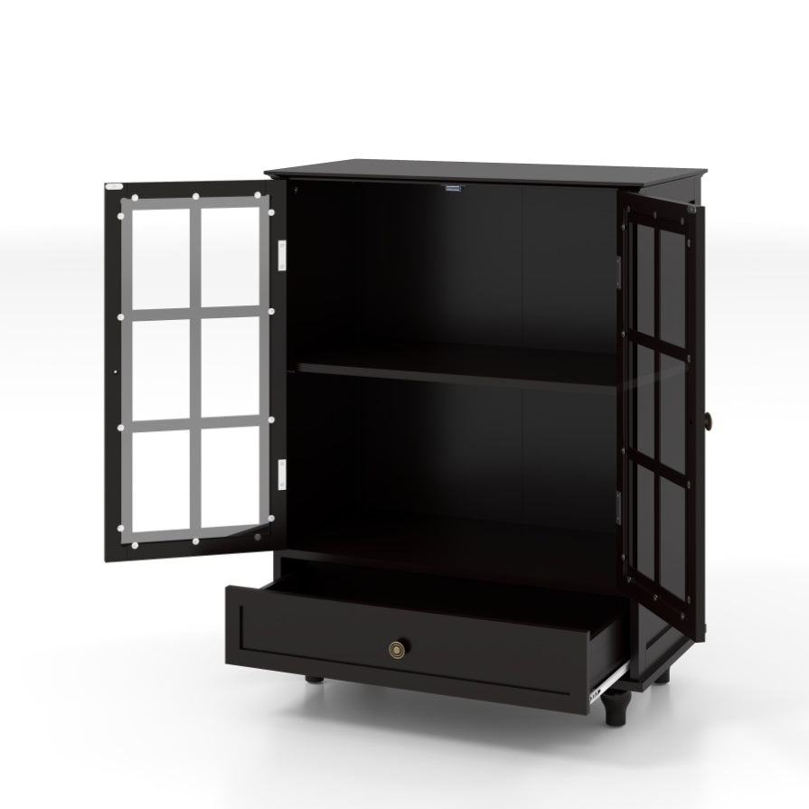 Highlights:1.Water-based painted MDF surface 2.Handsome vintage bronze handles 3.Shatter-resistant tempered glass 4.Durable vintage solid wood legs 5.Adjustable shelves to customize your storage space 6.Spacious bottom drawer for organized concealment 7.Smooth-gliding mechanism for effortless access 8.Gracefully curved top that elevates your room's aesthetic