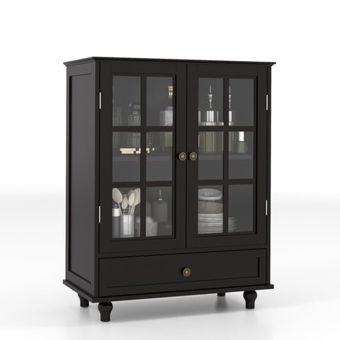 Minimalist Black Buffet Cabinet with Double Glass Doors and Drawer, Modern Wooden Storage Sideboard W2557P307942