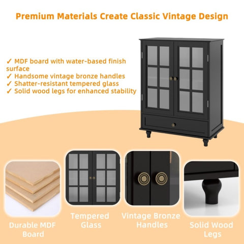 | Highlights | 1.Water-based painted MDF surface 2.Handsome vintage bronze handles 3.Shatter-resistant tempered glass 4.Durable vintage solid wood legs 5.Adjustable shelves to customize your storage space 6.Spacious bottom drawer for organized concealment 7.Smooth-gliding mechanism for effortless access 8.Gracefully curved top that elevates your room's aesthetic |