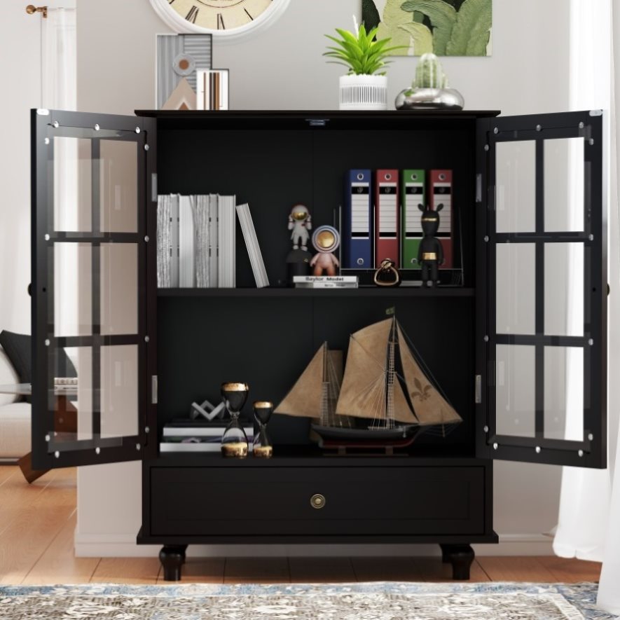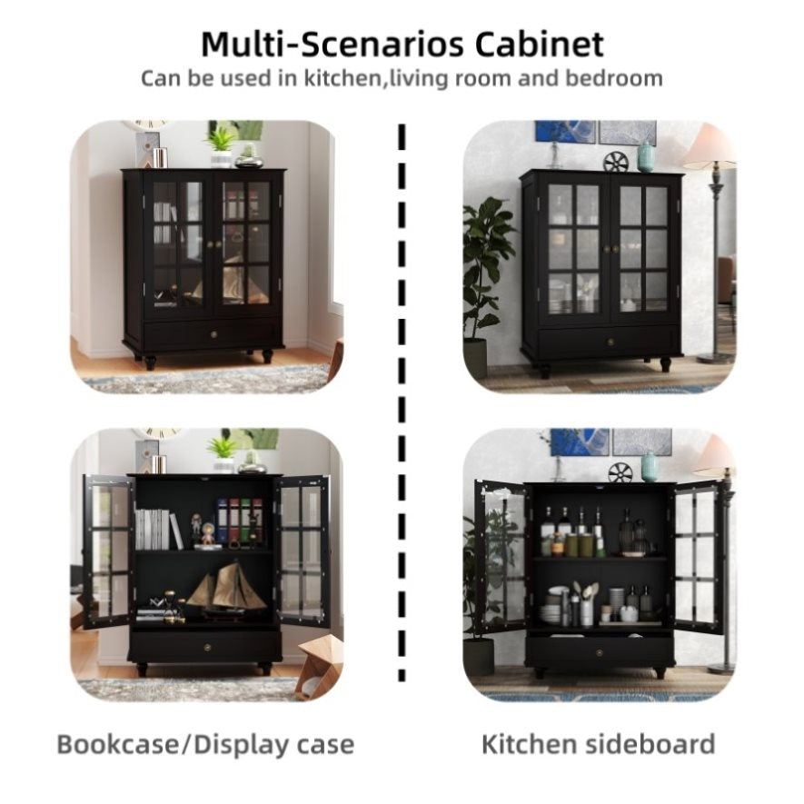 Multifunctional:This cabinet can be used as a sideboard in living room to fill in your favourite collections, or a buffet server cabinet in kitchen to put the tableware, bowls and dishes.With the glass doors you can show off as well as protect they from dust.