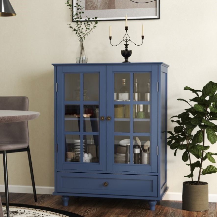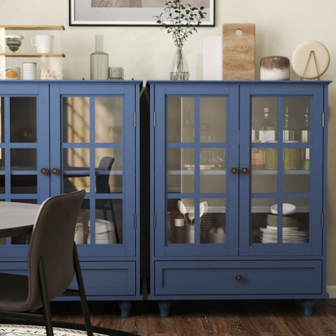 Minimalist Blue Buffet Cabinet with Double Glass Doors and Drawer, Modern Wooden Storage Sideboard W2557P307944