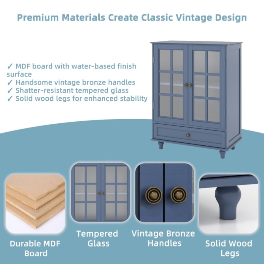 Highlights 1.MDF board with water-based finish surface 2.Handsome vintage bronze handles 3.Shatter-resistant tempered glass 4.Durable vintage solid wood legs 5.Adjustable shelves to customize your storage space 6.Spacious bottom drawer for organized concealment 7.Smooth-gliding mechanism for effortless access 8.Gracefully curved top that elevates your room's aesthetic