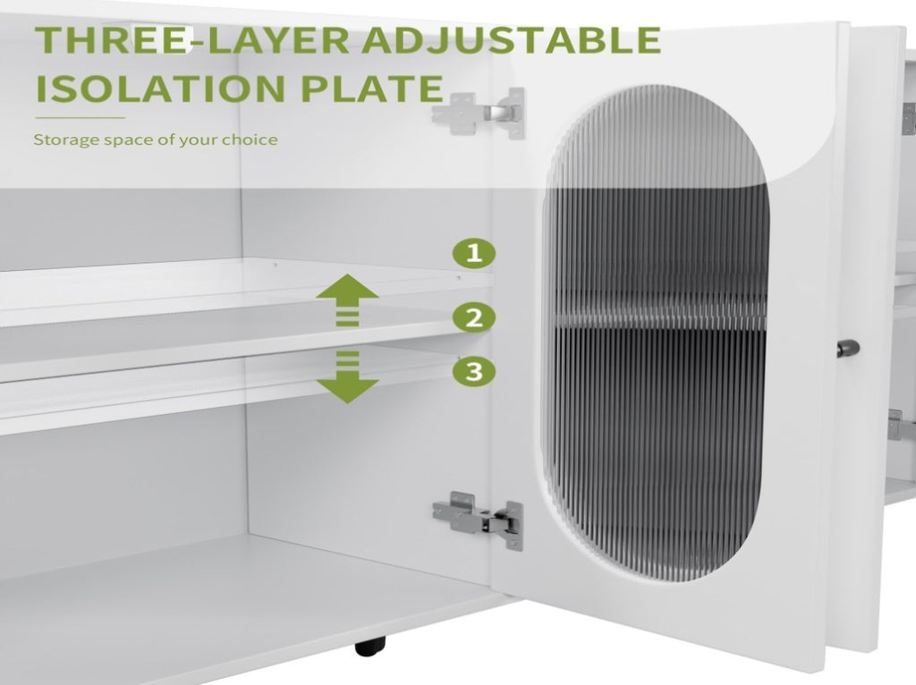 Large storage space: Partition storage design, large capacity, make the living room tidy and orderly. The sideboard has four closed big cabinets, the use of space is diverse. The shelf inside the door can be detached for fitting items of varied sizes.