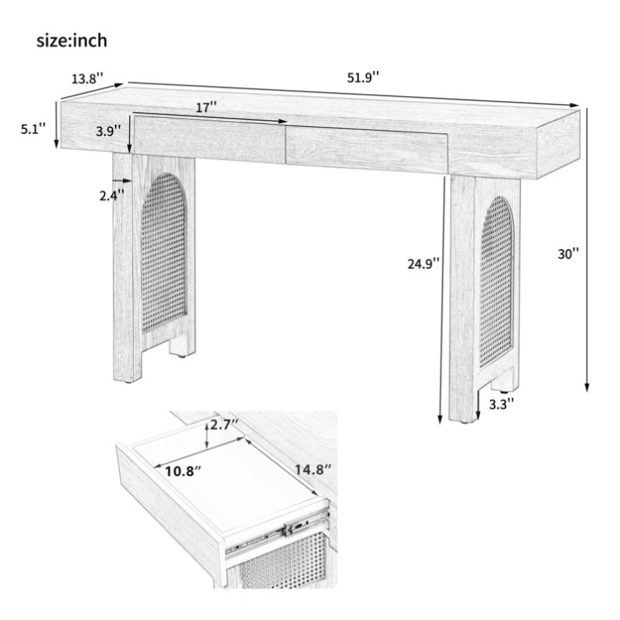 Stylish Rattan-Accented Design: Elevate your home’s aesthetics with this console table, featuring elegant rattan panels on the legs that exude a chic, bohemian vibe. The arched detailing enhances its sophisticated look, making it a versatile piece that complements modern, coastal, or rustic interiors effortlessly.