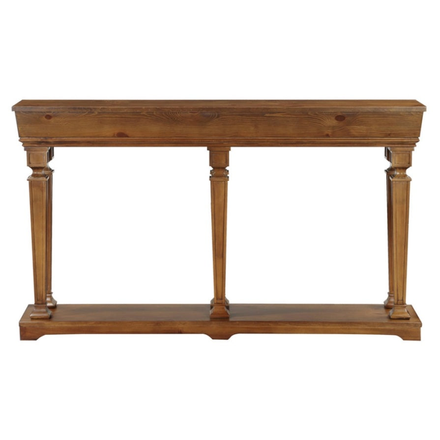 This rectangular table combines modern and traditional elements with square tapered wooden legs that ensure stability and aesthetic appeal. Its base includes a display shelf for showcasing decorative items or storing essentials like books and magazines, enhancing both functionality and visual interest.