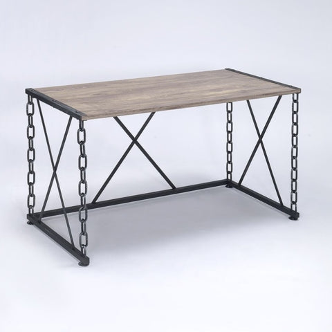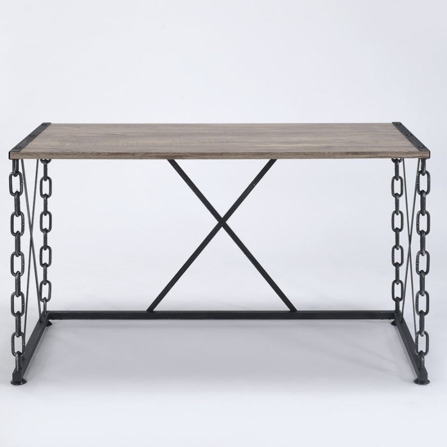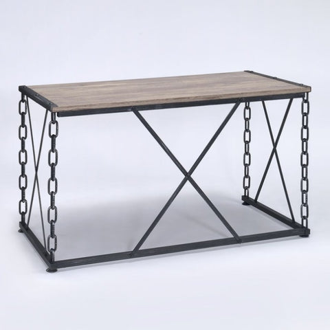 This console table features a stylish and functional rectangular design, ideal for a vanity or workspace, with a charming antique rustic oak finish that exudes natural warmth and vintage appeal. The antique black industrial metal chain frame adds a unique, eye-catching element, infusing an edgy industrial vibe perfect for enhancing any living area, hallway, or entryway.