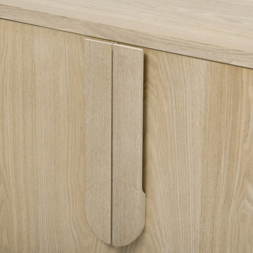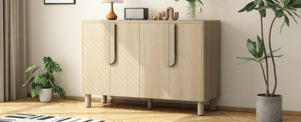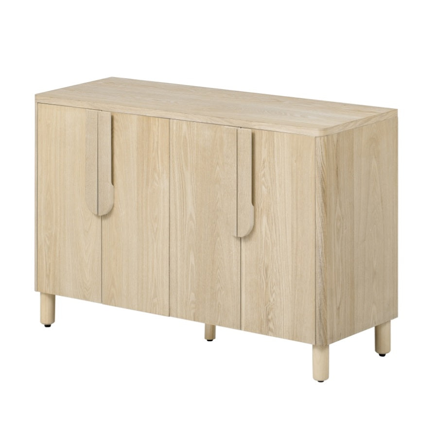 This sideboard buffet cabinet features a natural wood grain surface with an elegant ash veneer finish. The standout feature is its uniquely designed arc handles, which blend seamlessly into the cabinet doors, creating a sleek, minimalist look while ensuring effortless operation.