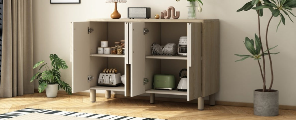 Sturdy Construction: Made from high-quality MDF with solid pine legs, the sideboard cabinet ensures long-lasting durability. Featuring solid cylindrical legs with adjustable foot pads and an additional center support, this design ensures superior stability, enhanced weight capacity, and long-lasting durability. The top surface supports up to 220 LBS, while each adjustable shelf holds 50 LBS, and the bottom shelf supports 66 LBS.